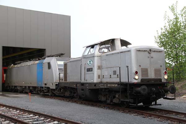 111 001(211 160) mit 186 141 beim Rangieren in der ITL Werkstatt in Pirna, 22.04.2014