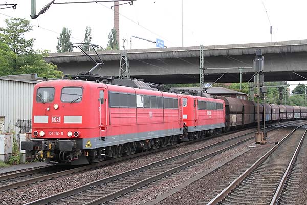 151 112+151 xxx mit Kohlewagen aus dem Hafen komment ri.Maschen