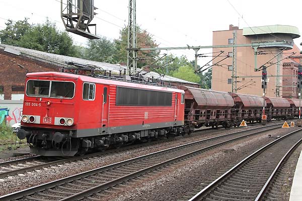 155 004 mit leeren Schüttgut Wagen vom Hafen komment ri.Maschen in Harburg