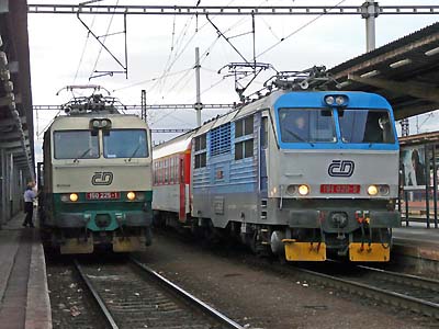 150 225 mit R 629 (Praha hl.n.-Horni Lidec) und 151 020 mit Ex 525 (Praha hl.n.-Luhacovice) in Olomouc