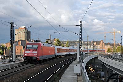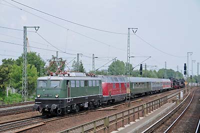 Einige Touren habe ich auch im Berliner Umland, dem sogenannten Berliner Speckgürtel, unternommen. Im Werk Bombardier stand der Urvater der Traxx die 12X 128 001 (Bild 04) abgestellt und wird im September am Tag der offenen Tür präsentiert. Leider ist die Zukunft der 12X ungewiss... Seit dem kleinen Fahrplanwechsel sind einige DB-Stiere in den Fernverkehr anzutreffen, wo sie vor IC bzw. EC eingesetzt werden. In Großbeeren fuhr 182 006 mit dem EC 175 (Bild 05) aus Hamburg kommend in Richtung Dresden und fährt am Nachmittag mit dem EC 174 wieder zurück in die Hansestadt. Bei Thyrow begegnete mir der Dykerhoff-Stier ES64U2-002 (Bild 06) mit dem Zementzug aus Berlin in Richtung Lutherstadt Wittenberg. Für mich, einer der schönsten Fotopunkte im Berliner Umland, ist die Templiner Eisenbahnbrücke und dort überquerte die Traxx 185 003 (Bild 07), jetzt ohne Seitenwerbung, mit dem Güterzug den Templiner See. Auf dem westlichen Aussenring waren die CTL-Lok ES64F4-209 (Bild 08) mit ihrem Güterzug und der Altbau-Einheitselok 140 401 (Bild 09) mit ihrem Gaskessel gen Süden unterwegs.