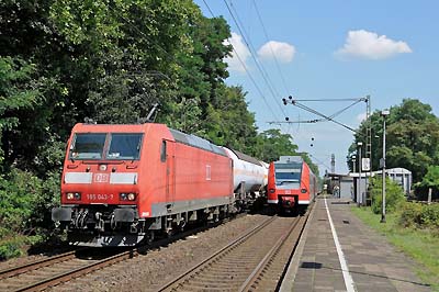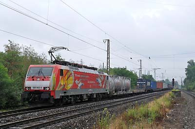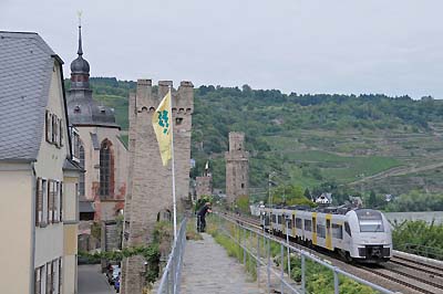 Ab zum Rhein... In Bingen durchfuhr die 145 002 (Bild 46) mit dem Chemiecontainer das Reiterstellwerk und fuhr in Richtung Mainz. An der Altstadt von Oberwesel vorbei fuhr die 151 060 (Bild 47) mit Stahlkisten rheinwärts in Richtung Bingen. Der Transregio 460 505 (Bild 48) war als MRB auf dem Weg von Koblenz über Oberwesel nach Mainz. In der schönen Rheinlandschaft fuhr die 145 040 (Bild 49) mit dem KLV Ambrogio den Rhein weiter in Richtung Koblenz. Danach ging es zur Eisenbahn-Fotografenhochburg Köln-Süd. Dort war am späten Nachmittag die belgische 186 212 (Bild 50) mit dem Güterzug nach Aachen-West unterwegs.