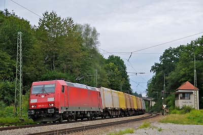 Die nächste Tour führte wie bei jeder Deutschlandtour nach Bayern. Im Münchner Hauptbahnhof stand die Arriva-Werbelok 183 001 (Bild 51) abgestellt und wird etwas später einen ALX-Zug nach Regensburg übernehmen. Im oberbayerischen Aßling fuhr die 185 314 (Bild 52) mit dem Innofreight-Zug zum Brenner. Aus der Gegenrichtung kam die Railpool/TXL-Traxx 185 697 (Bild 53) mit leeren Autotransporterwagen und fuhr in Richtung Gbf. München-Ost. Die Leihlok von NordCargo ES64F4-089 (Bild 54) war mit EC aus München auf dem Weg zum Brenner unterwegs und kam durch Brannenburg. In Niederaudorf begegnete mir der „Roten Teufel“ von Lokomotion 185 166 und die beiden abgebügelten Lokomotion-Altbauloks 139 260 und 139 230 (Bild 55) vor dem gemischten Güterzug. Aus der Gegenrichtung kam die Lokomotion ES64F4-012 mit der „MOVING EUROPE“-Reklame (Bild 56) und war mit den Stahlkisten auf dem Weg zum Brenner. Am Nachmittag kam das Railpool-Zebra 186 102 und 186 281 (Bild 57) mit dem KLV am Kloster Reisach vorbei und fuhr in Richtung Gbf. München-Ost. In München Hbf. konnte man fast alle ICE-Garnituren aufnehmen, der ICE 401 007 (Bild 58) verliess gerade den Hauptbahnhof.