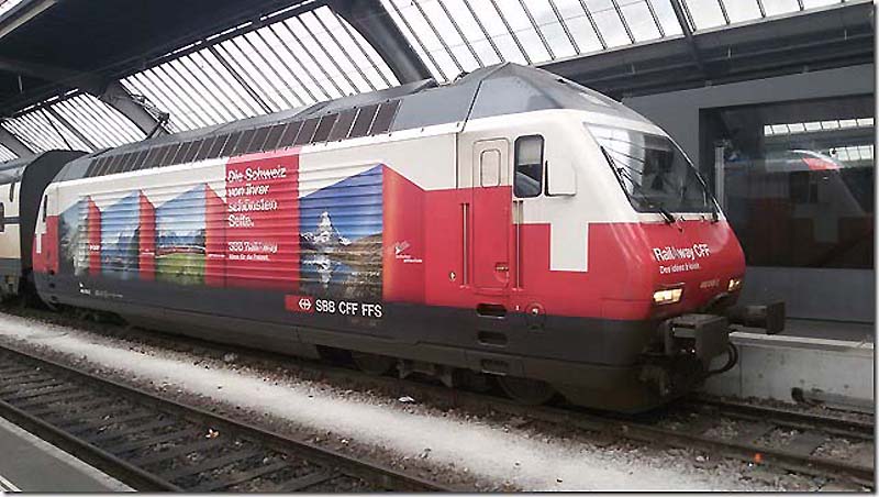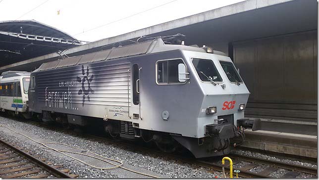 Re 91 85 4 446 017-6 EIN HAUCH FERNWEH Werbung für den Voralpenexpress Luzern-St.Gallen am 29.02.16 in Luzern. Hinter dieser Lok verbirgt sich eine weitere ehemalige Re 4/4 IV der SBB von 1982