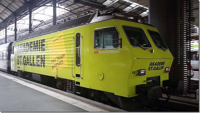 Re 91 85 4 446 018-4 AKADEMIE ST.GALLEN am 29.02.16 in Luzern. Hinter dieser Lok verbirgt sich die ehemalige Re 4/4 IV der SBB von 1982