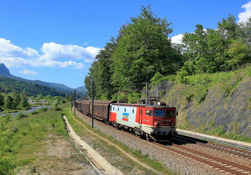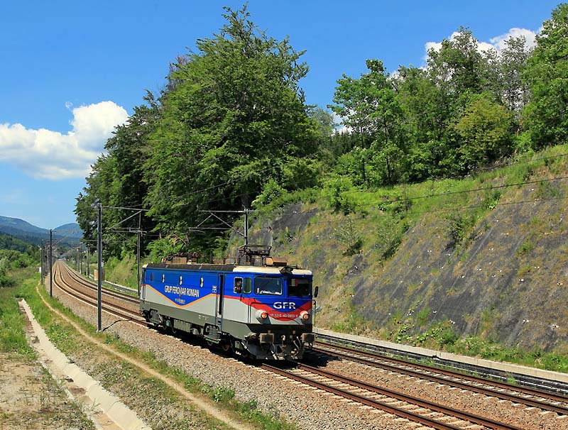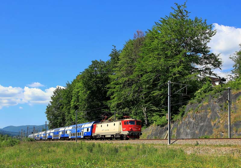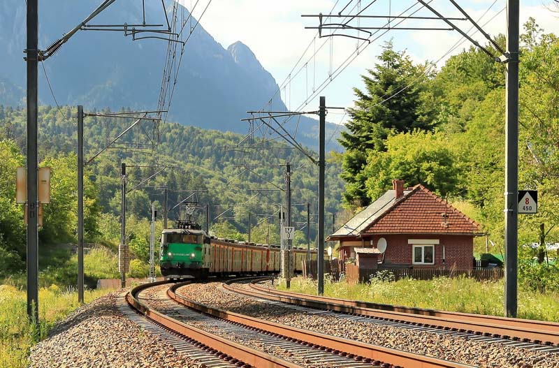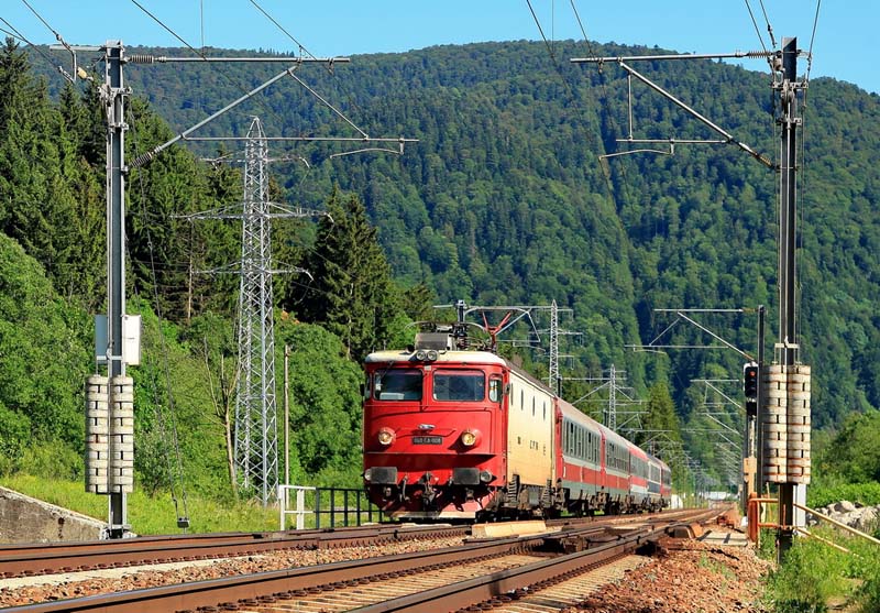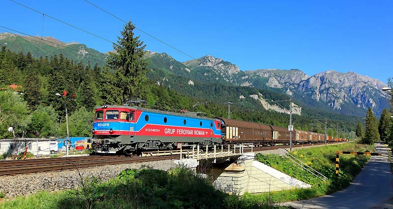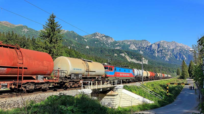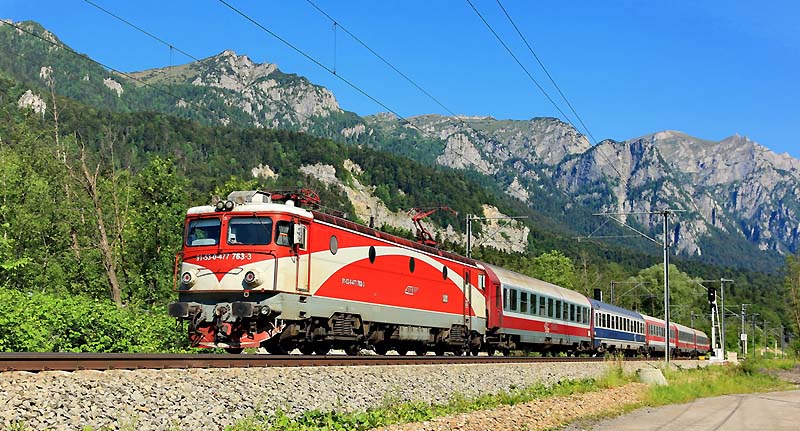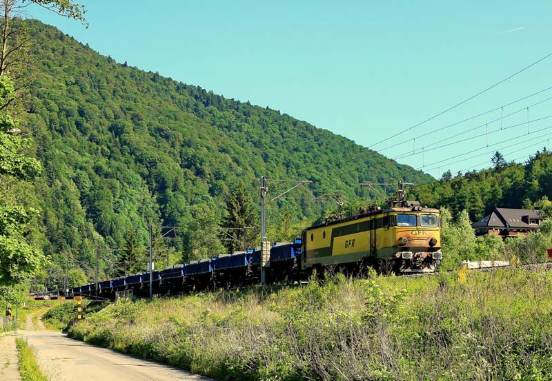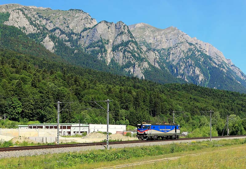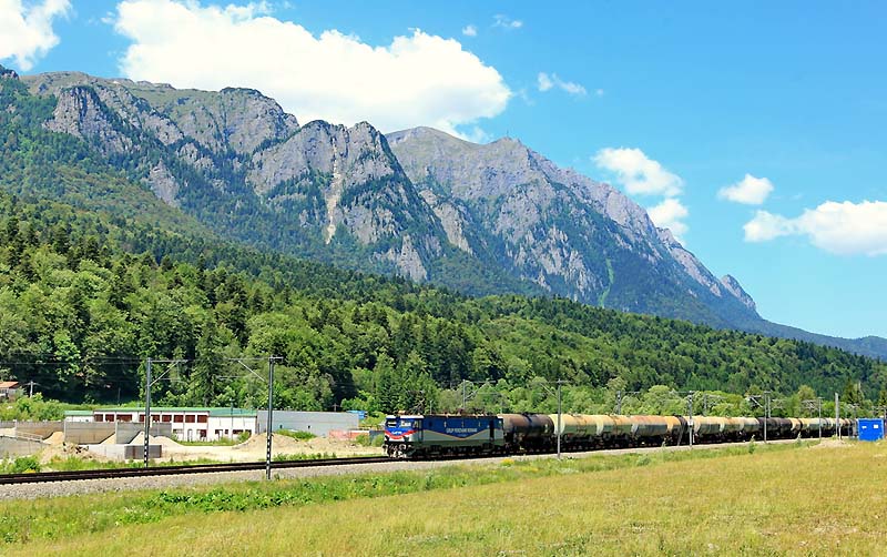 Elektrische Zugförderung in Rumänien im Prahova Tal, Juni 2015: Im Ort Sinaia, am Fuße der Karpaten, verläuft die Strecke Bukarest - Ploiesti - Kronstadt/Brasov. Interessant sind u.a. die schweren Güterzüge mit Zwischenlok, eine Beförderungsart die in Rumänien, auf dieser Strecke schon seit Jahrzehnten verwendet wird - früher mit bis zu 5 Dampfloks der ehemaligen Baureihe 140.200-400 (identisch mit DRG G8.2). An solchen Zügen werden gelegentlich sowohl staatliche CFR wie auch private Loks gemeinsam eingesetzt. Ersichtlich ist auch der neue rumänische Schnelltriebwagen, der Hyperion, der diese Strecke auch täglich befährt.