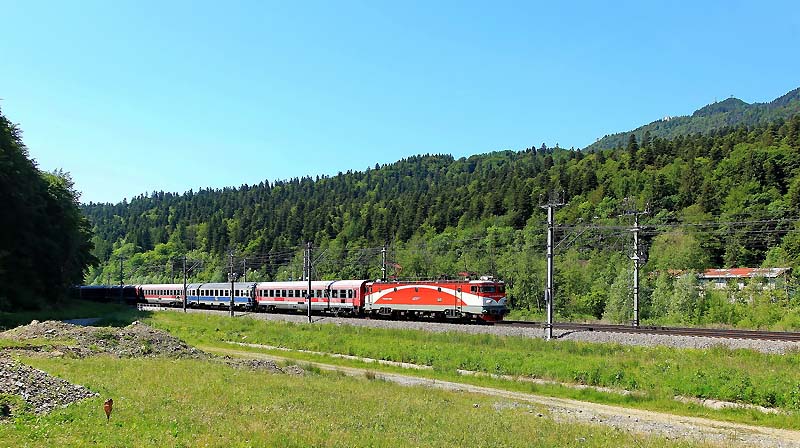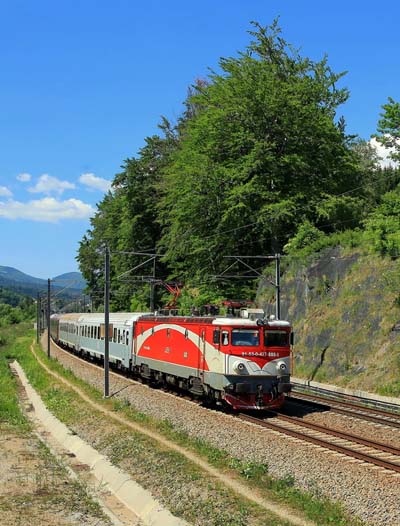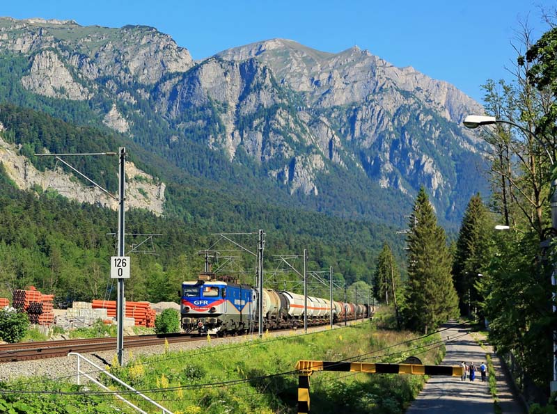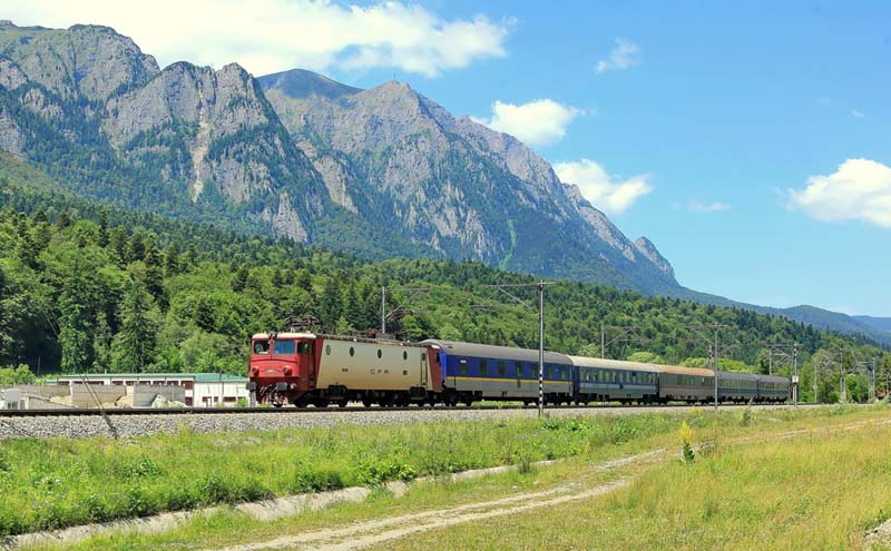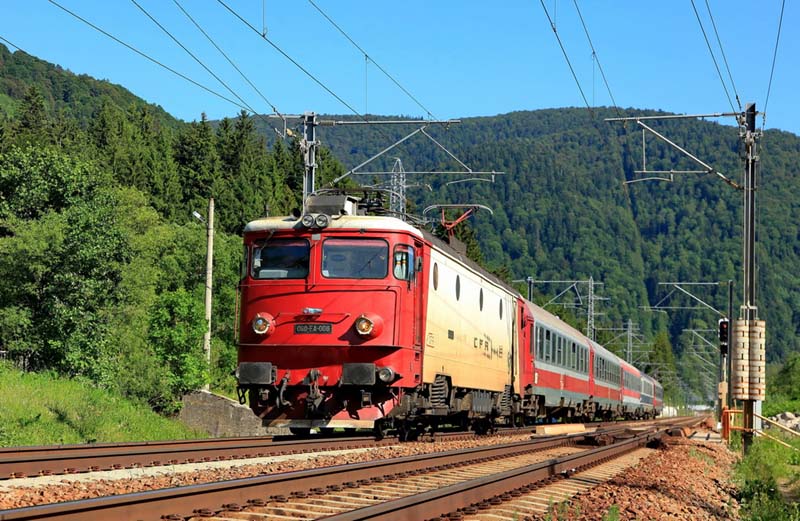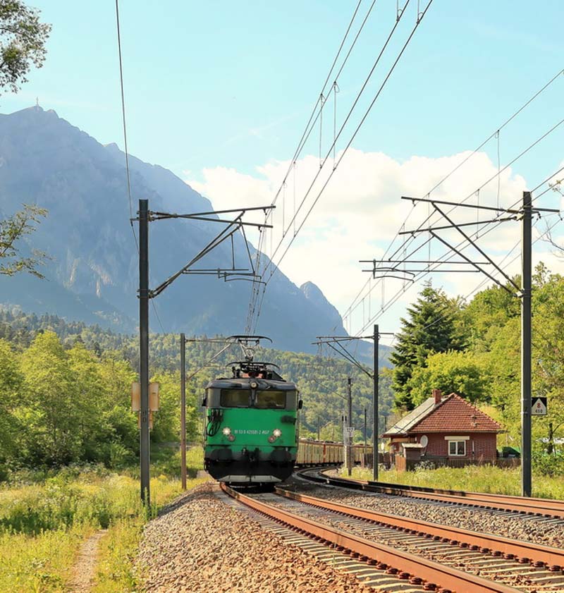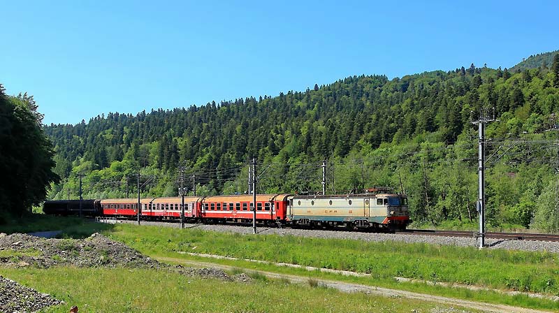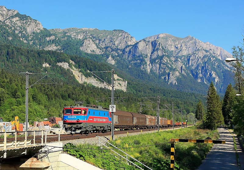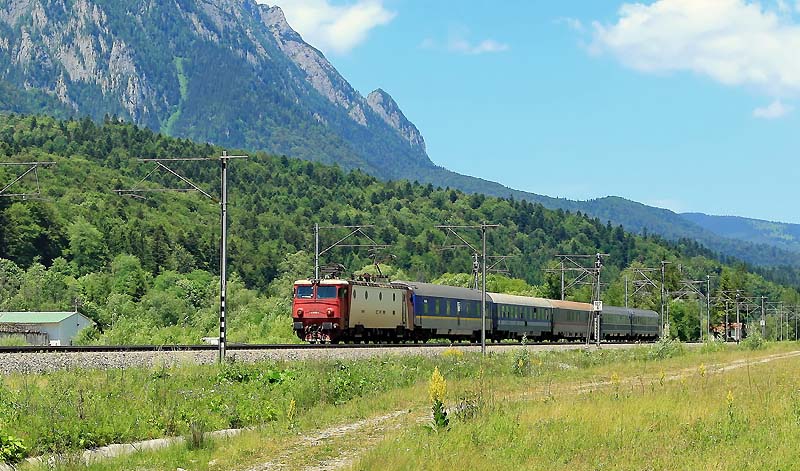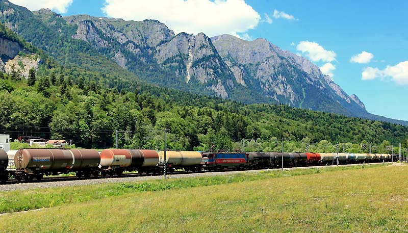 Elektrische Zugförderung in Rumänien im Prahova Tal, Juni 2015: Im Ort Sinaia, am Fuße der Karpaten, verläuft die Strecke Bukarest - Ploiesti - Kronstadt/Brasov. Interessant sind u.a. die schweren Güterzüge mit Zwischenlok, eine Beförderungsart die in Rumänien, auf dieser Strecke schon seit Jahrzehnten verwendet wird - früher mit bis zu 5 Dampfloks der ehemaligen Baureihe 140.200-400 (identisch mit DRG G8.2). An solchen Zügen werden gelegentlich sowohl staatliche CFR wie auch private Loks gemeinsam eingesetzt. Ersichtlich ist auch der neue rumänische Schnelltriebwagen, der Hyperion, der diese Strecke auch täglich befährt.