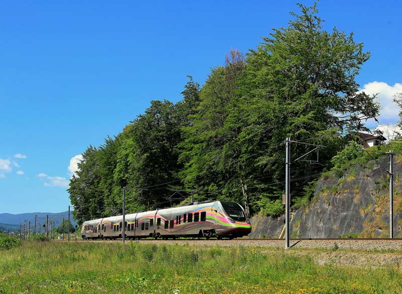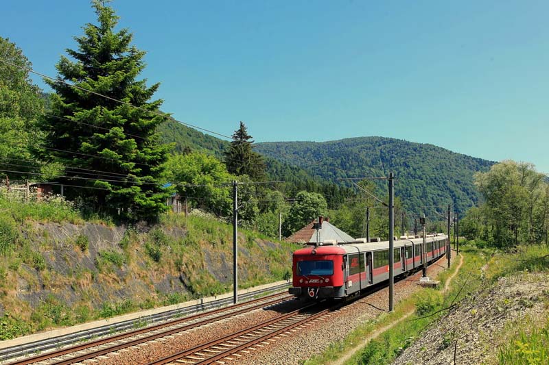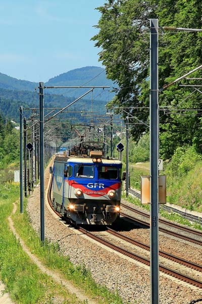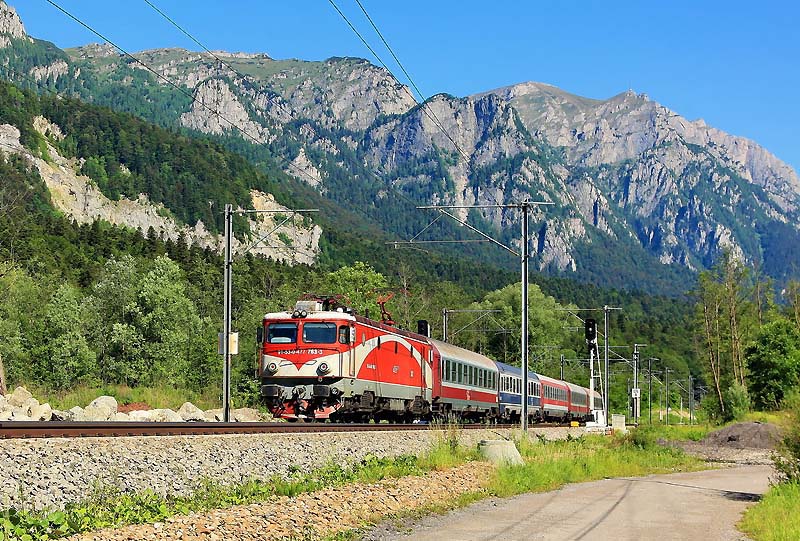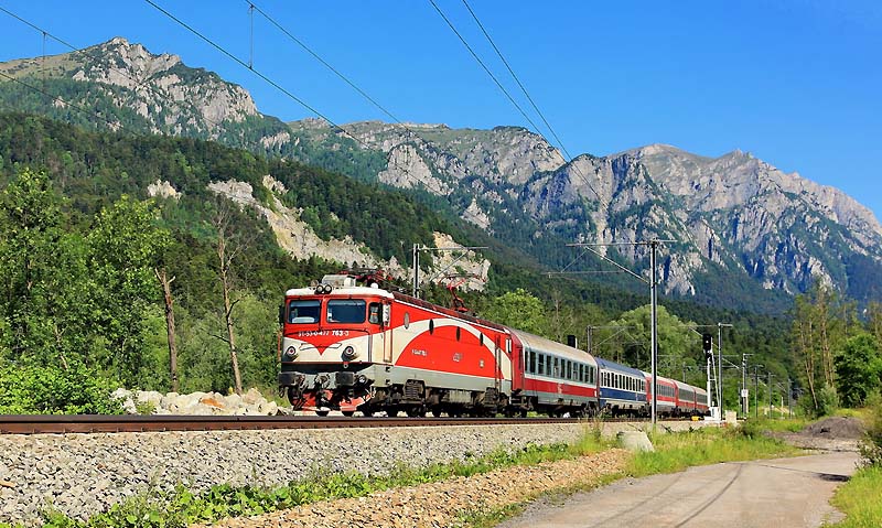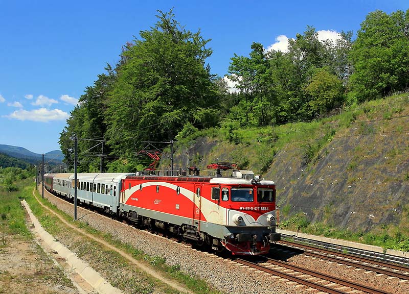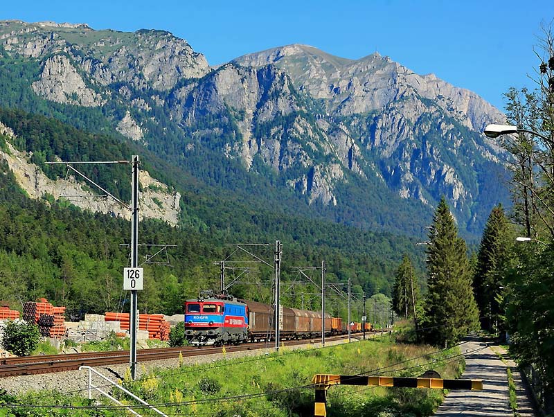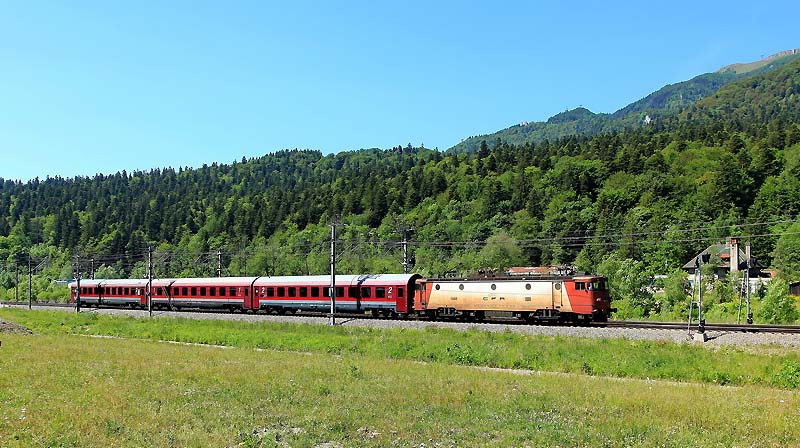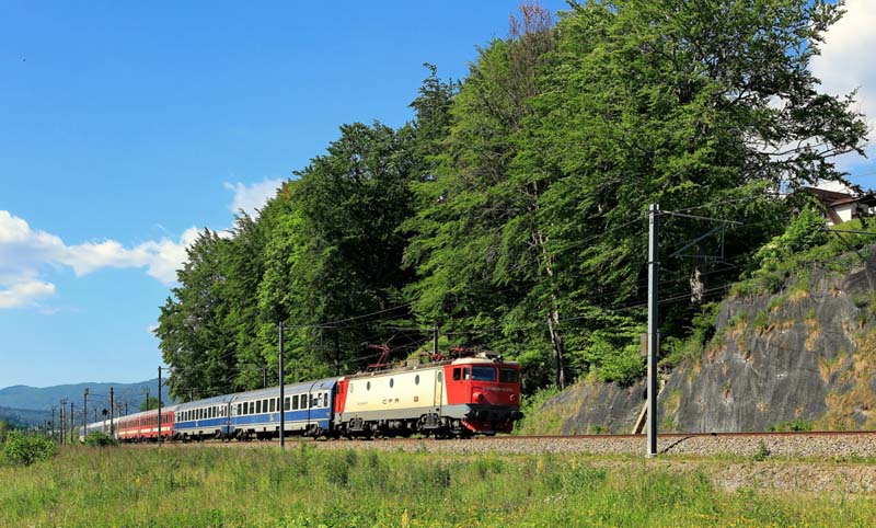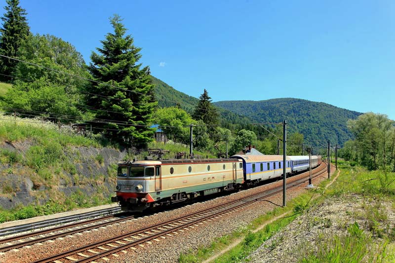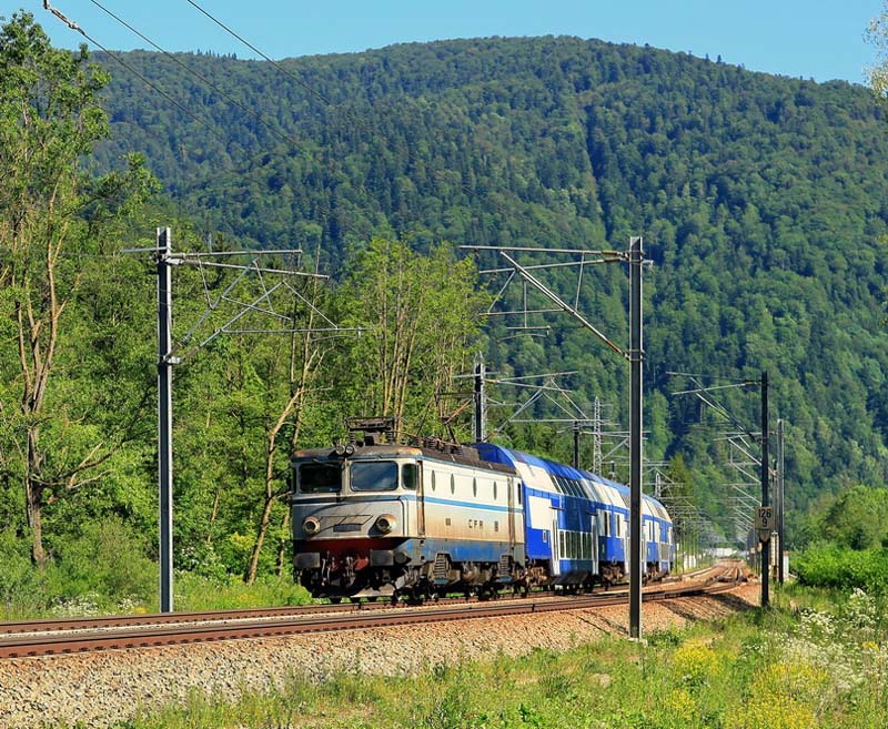 Elektrische Zugförderung in Rumänien im Prahova Tal, Juni 2015: Im Ort Sinaia, am Fuße der Karpaten, verläuft die Strecke Bukarest - Ploiesti - Kronstadt/Brasov. Interessant sind u.a. die schweren Güterzüge mit Zwischenlok, eine Beförderungsart die in Rumänien, auf dieser Strecke schon seit Jahrzehnten verwendet wird - früher mit bis zu 5 Dampfloks der ehemaligen Baureihe 140.200-400 (identisch mit DRG G8.2). An solchen Zügen werden gelegentlich sowohl staatliche CFR wie auch private Loks gemeinsam eingesetzt. Ersichtlich ist auch der neue rumänische Schnelltriebwagen, der Hyperion, der diese Strecke auch täglich befährt.