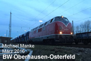 Am 26.03.2016 stattete ich dem BW Oberhausen-Osterfeld am gleichnamigen Rangierbahnhof einen Besuch ab. Der Rangierbahnhof erstreckt sich von Osterfeld-Mitte im Westen, wo auch die Verkehrsstation OB-Osterfeld Süd liegt, und Bottrop-Vonderort im Osten. Die Anlage liegt an der Bahnstrecke Duisburg - Dorsten - Rheine - Quakenbrück der Rheinischen Bahn, die freilich im Bereich nördlich von Dorsten deutlich an Bedeutung verloren hat und sogar in weiten Teilen zwischen Coesfeld - Rheine - Quakenbrück bereits abgebaut ist und der Emschertalbahn Duisburg - Wanne-Eickel Hbf - Dortmund der Cöln-Mindener Eisenbahn. Daneben existierte bereits sehr früh die Verbindung OB-Sterkrade - Osterfeld. Erst 1905 kam die wichtige Güterumgehungsstrecke Hamm - Recklinghausen - Osterfeld hinzu.