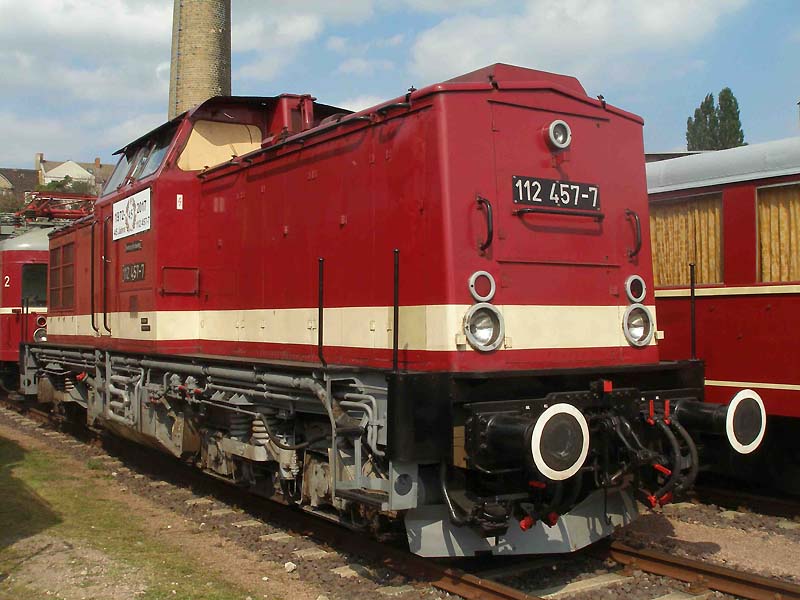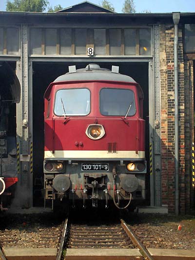 112 457-7 hat einen Aufkleber erhalten „ 1972 – 2017 45 Jahre 112 457-7“ und ist ebenfalls im Freigelände abgestellt. 130 101-9 hat dagegen einen Platz im Lokschuppen und schaut neugierig heraus.
