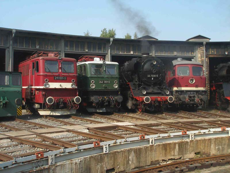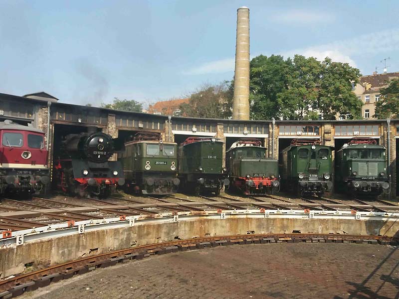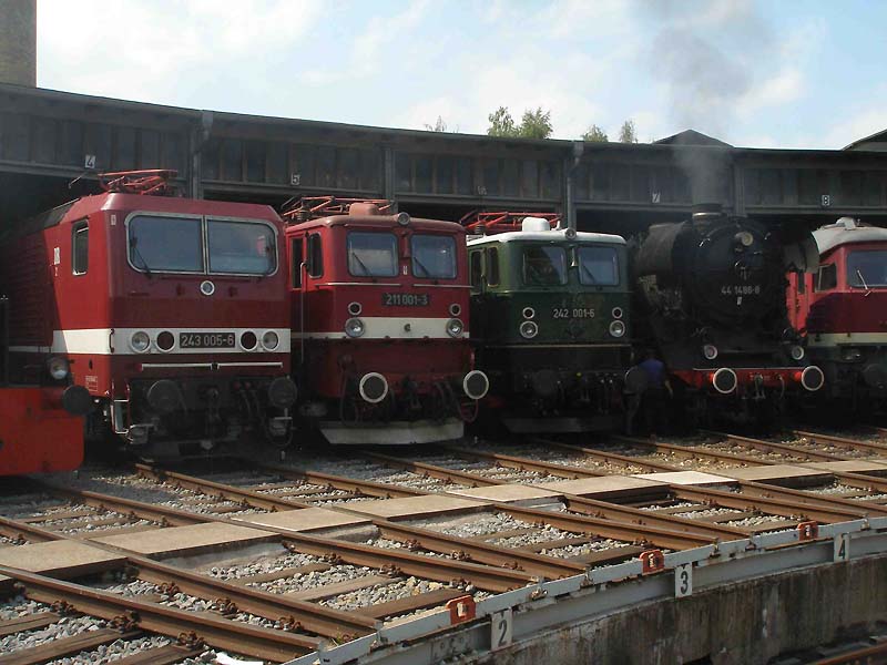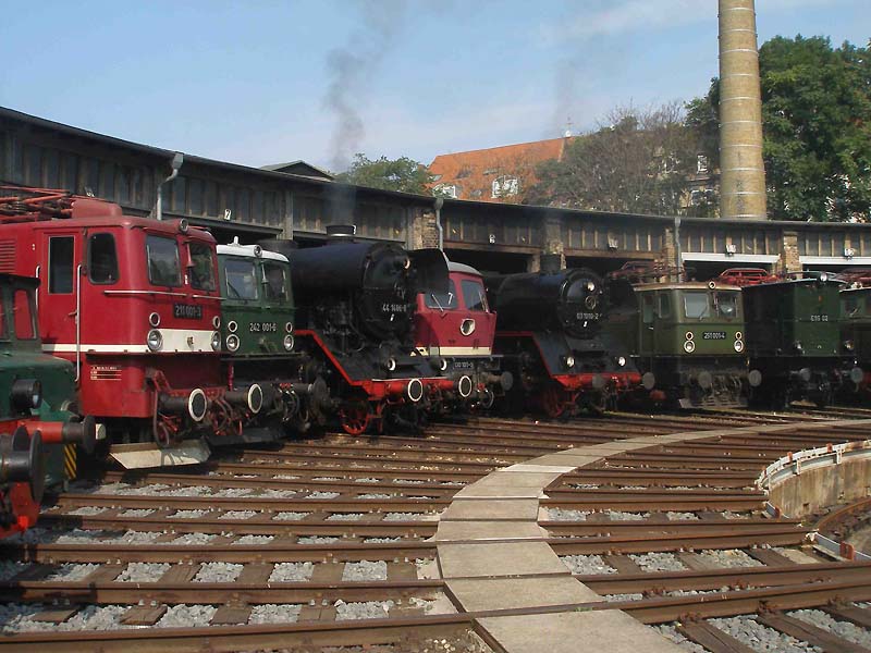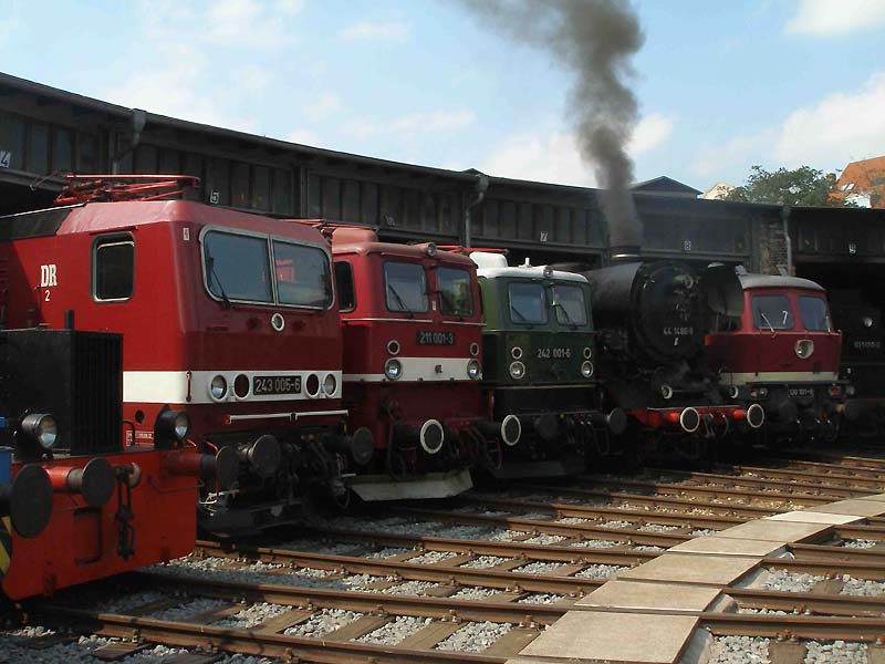 Zu Beginn ein Blick in die Rotunde des Lokschuppens. Die Mitarbeiter der Ausstellung haben zeitweise die Drehscheibe für die Fotografen freigegeben und für ein freies „Schussfeld“ gesorgt. Vielen Dank nochmal dafür. Hier stehen die neueren DR-Maschinen 243 005-6, 211 001-3, 242 001-6 sowie das ältere Vorgängermodell, die Dampflok 44 1486-8.