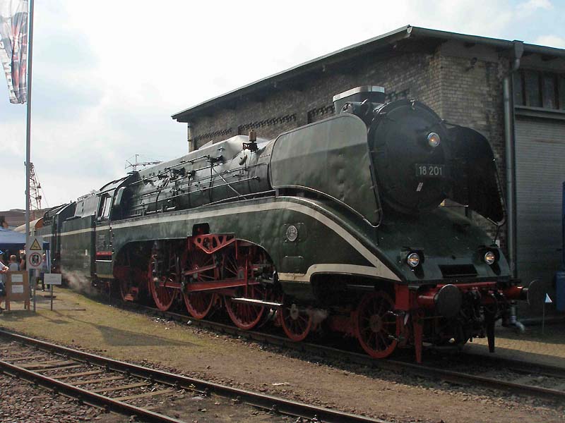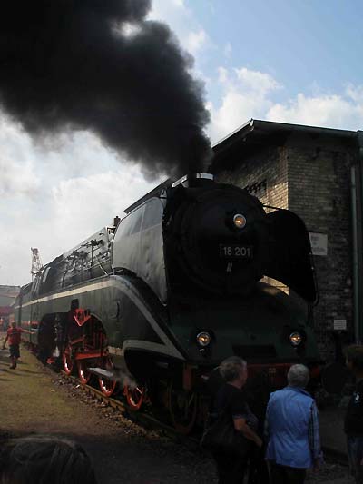 Die 18 201 der VES Halle steht neben dem Ringlokschuppen, ist unter Dampf, kommt aber leider nicht auf die Drehscheibe (vermutlich wegen dem zweiten angehängten Öltender). zwischendurch schickt 18 201 schwarze Rauchwolken gegen den Himmel.