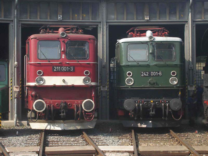 211 001-3 und 242 001-6 stehen einträchtig nebeneinander in den Ständen 5 und 6.