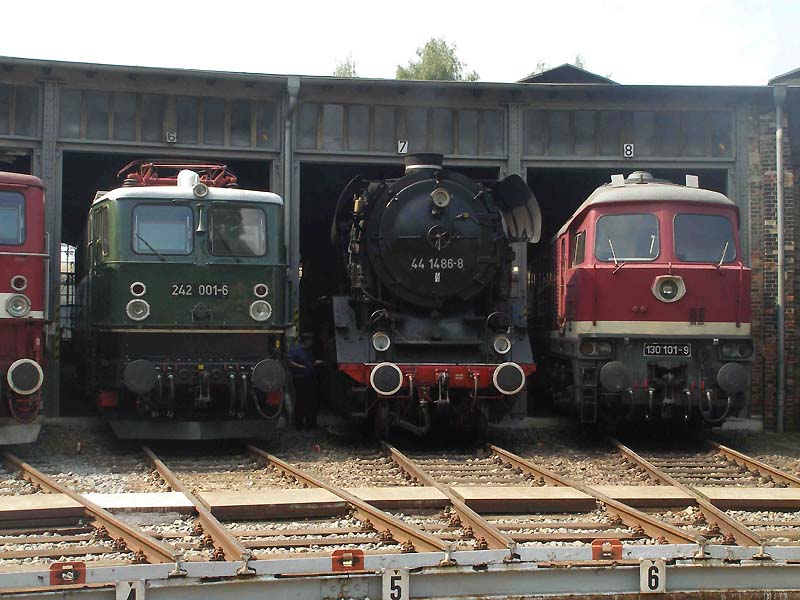 Die drei Traktionsarten mit 242 001-6, 44 1486-8 und 130 101-9