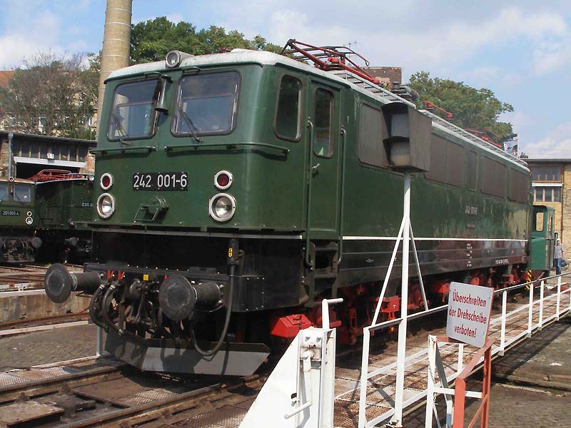 242 001-6 wurde auf die Drehscheibe gezogen und dreht nun ihre Runden. Frontansicht der 242 001-6 auf der Drehscheibe.