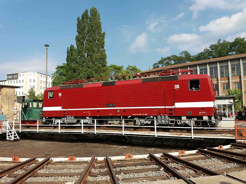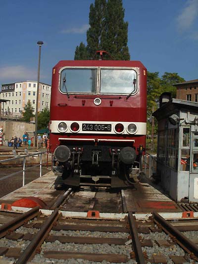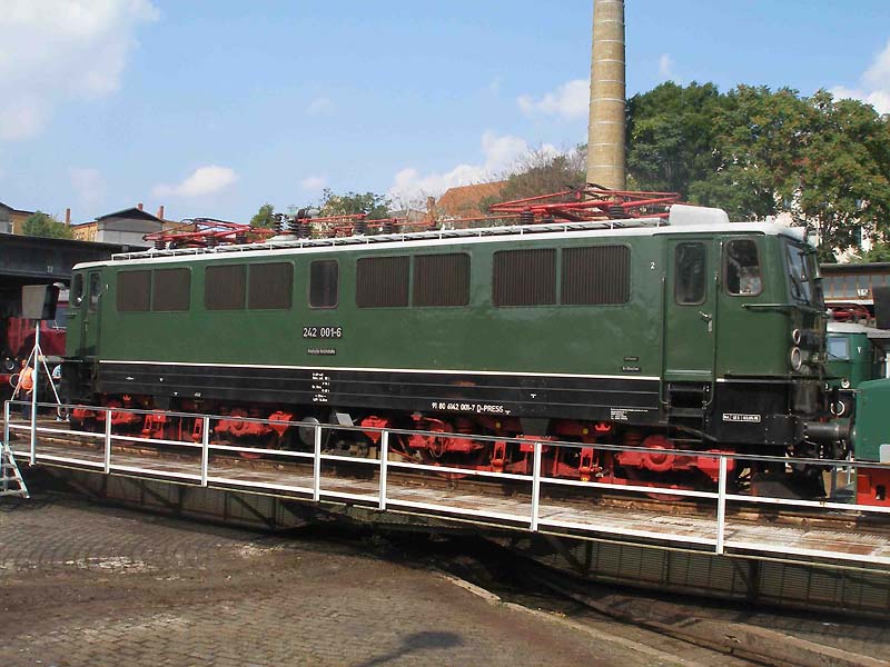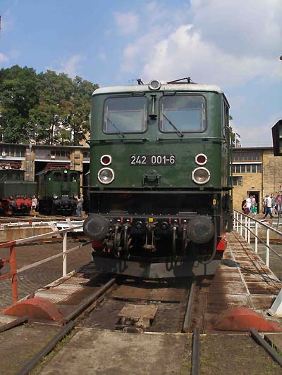 242 001-6 der PRESS ist auch zu Gast und wird auf der Drehscheibe zur Schau gestellt. 243 005-6 in Frontansicht auf der Drehscheibe.