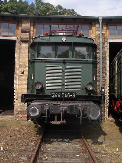 244 046-9 vor dem Lokschuppen. Auch diese Maschinen waren früher in Oberbayern unterwegs, z.B. auf der Strecke Traunstein – Ruhpolding mit ihrem Wendezug, der lange Zeit das „hässliche Entlein“ als Steuerwagen hatte.