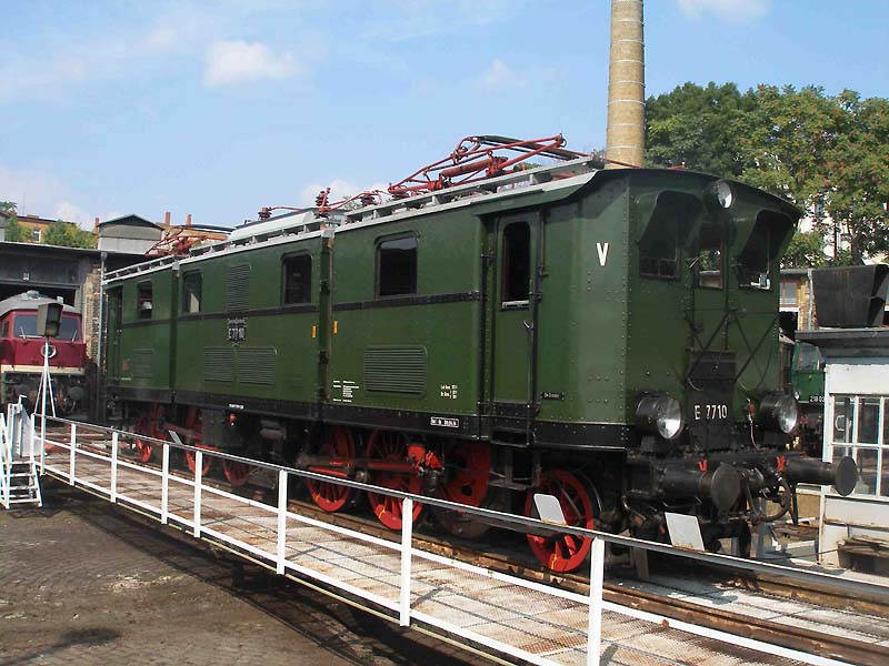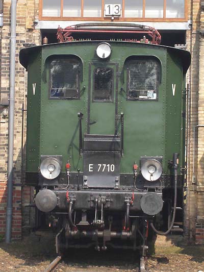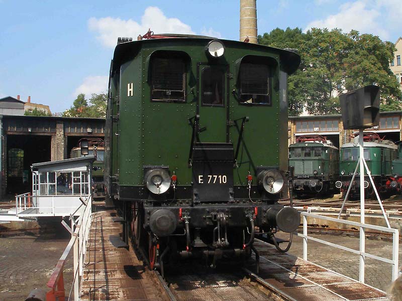 Frontansicht der E 7710 auf der Drehscheibe. E95 02 schaut schon aus dem Ringschuppen heraus.