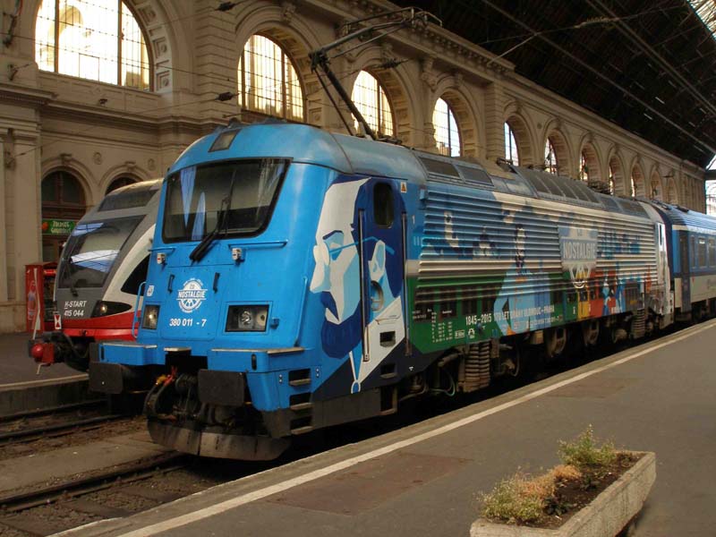CD 380 011-7 =NOSTALGIE= fährt mit einem CD-Zug aus Budapest Keleti pu. aus (Seite 2-1). (04.07.2016)