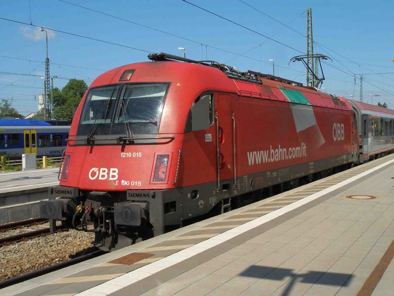 Bei der Fahrt mit dem Zug von Traunstein nach Kufstein war fahrplanmäßig ein Aufenthalt in Rosenheim. Hier kam mir die 1216 015 vor die Linse, die den EC 85 nach Bologna befördert.
