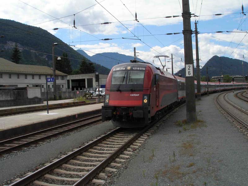RailJet-Maschine 1216 018 fährt mit dem EC 82 in den Bahnhof Kufstein ein.