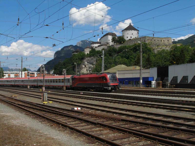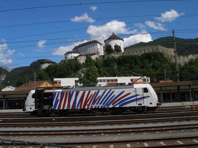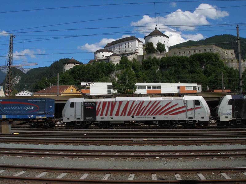 186 281 Lokomotion, aufgenommen bei der Ausfahrt aus dem Bahnhof Kufstein vor der Festung Kufstein.