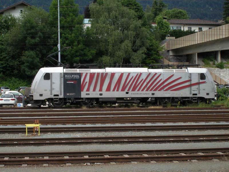 Im Bahnhof Kufstein steht die 186 285 von Railpool im roten Zebralook auf dem Abstellgleis und wartet auf den nächsten Einsatz, der bald kommen soll.