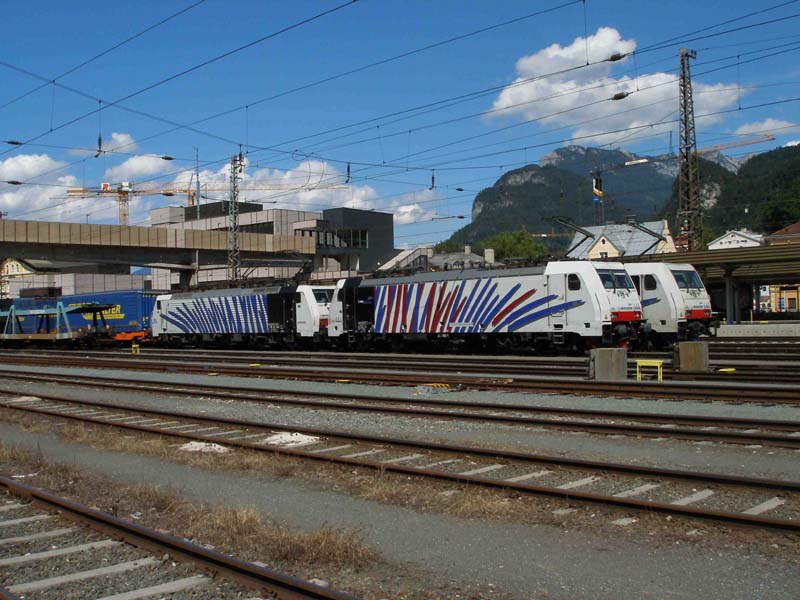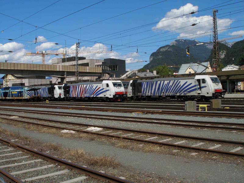 186 440 Lokomotion war mit dem Lokzug vom Brenner gekommen und unterstützt nun die 186 281. 189 914 Lokomotion, 186 281 Railpool/Lokomotion, 186 444 Railpool und 186 440 stehen nun abfahrbereit nebeneinander im Bahnhof Kufstein.
