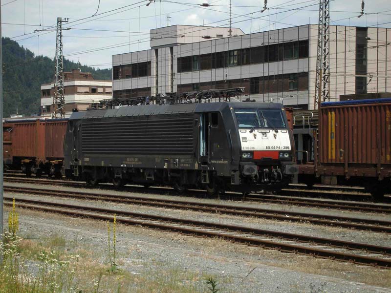 189 286 (MRCE in Schwarz) steht nach einigen Hin- und Herfahrten abgebügelt im Bahnhof Kufstein.