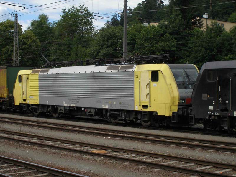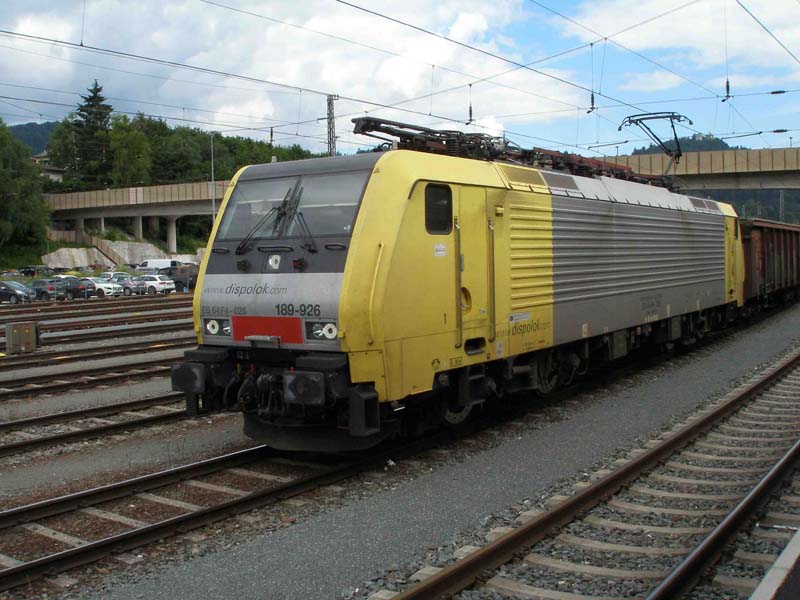 189 926 (Dispo in Gelb) ist mit einem Ton-Zug Im Bahnhof Kufstein eingetroffen und wird kurze Zeit danach von diesem Zug abgekuppelt.