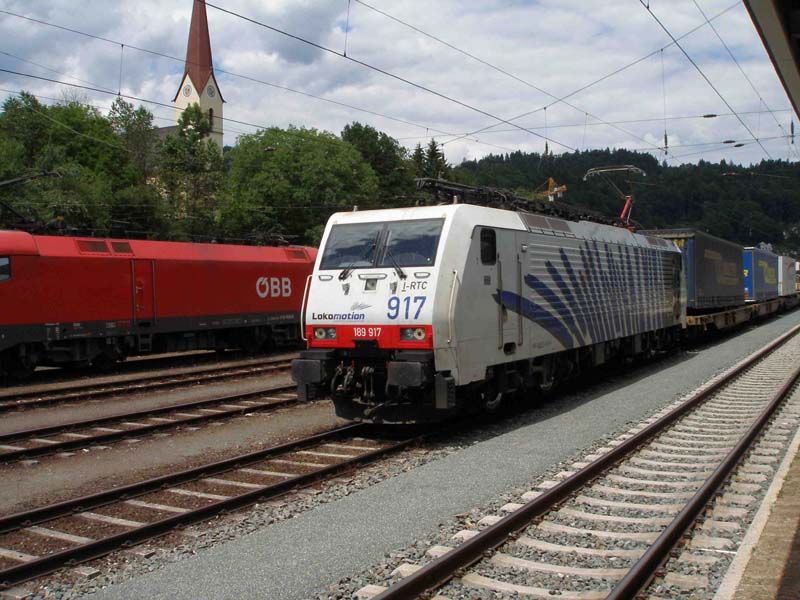 189 917 Lokomotion fährt mit einem Güterzug von München kommend im den Bahnhof Kufstein ein.