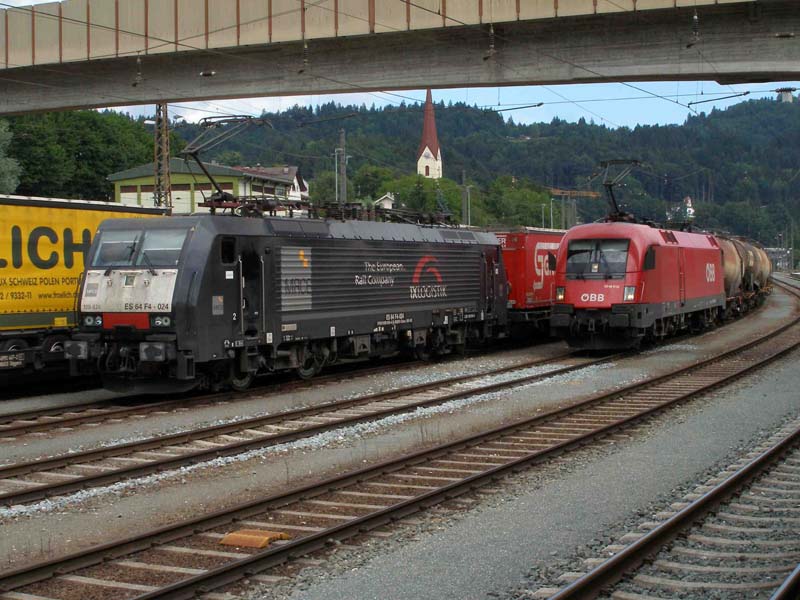 Im Bahnhof Kufstein steht noch immer die 189 924, die 1016 015 bekommt dagegen sofort Durchfahrt und rauscht an ihrer Kollegin vorbei Richtung Innsbruck.