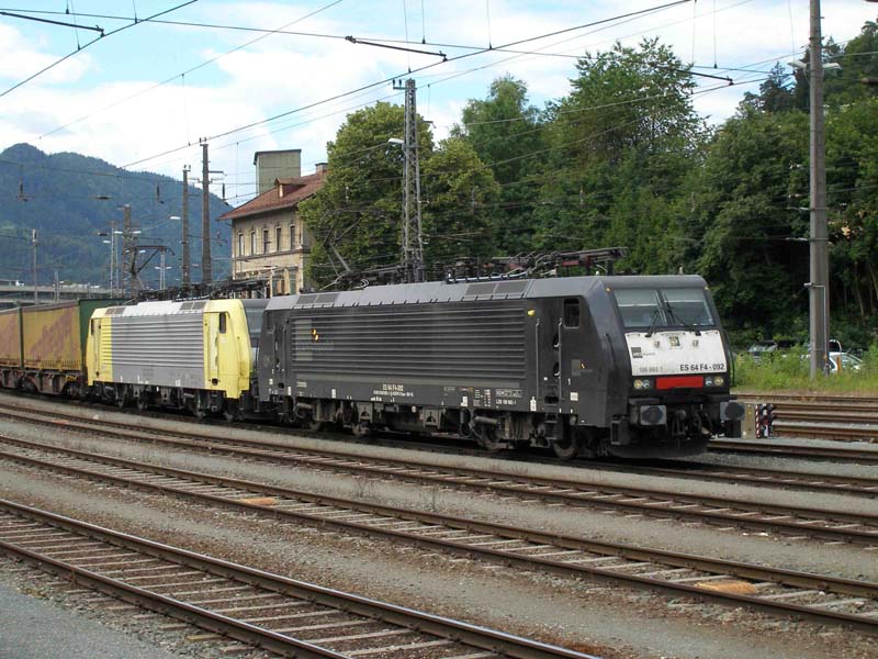 189 992 (MRCE in Schwarz) bringt gemeinsam mit 189 909 (Dispo in Gelb) einen Güterzug vom Brenner in den Bahnhof Kufstein.