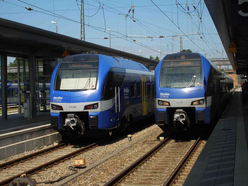 Im Bahnhof Rosenheim treffen sich die beiden MER ET 326 und ET 317 und warten nun auf die Rückleistungen.