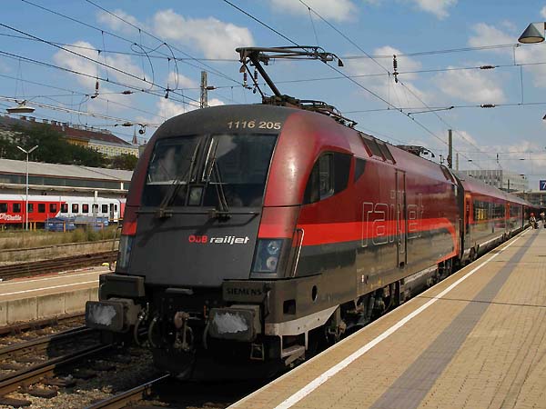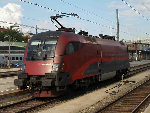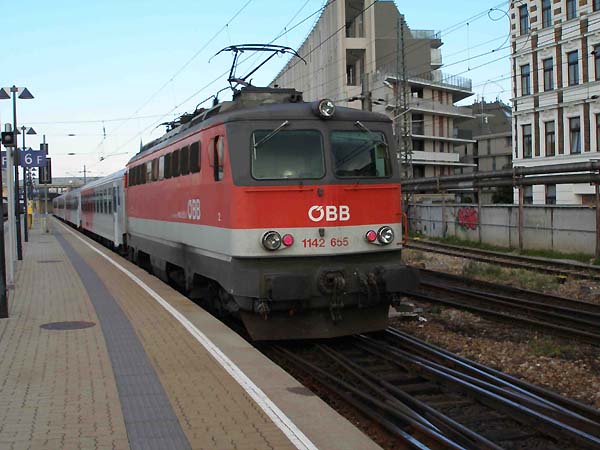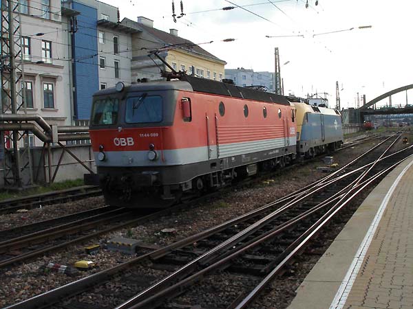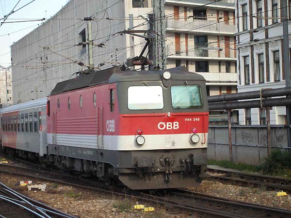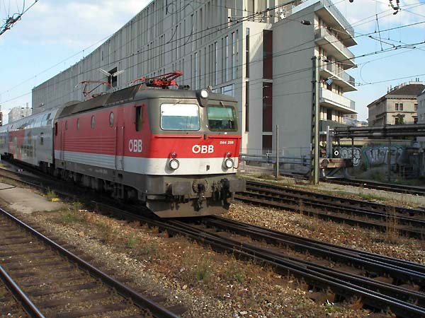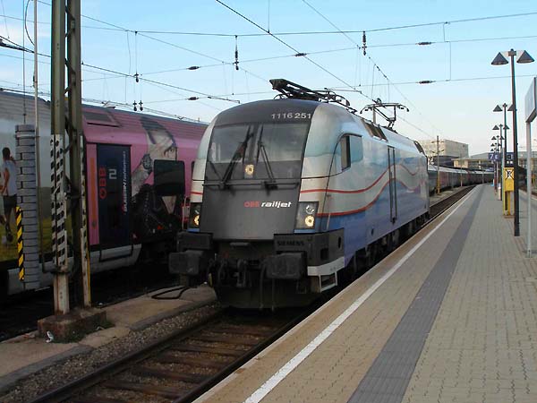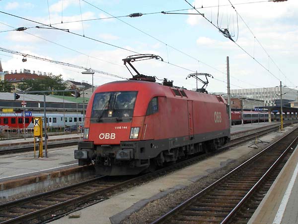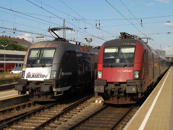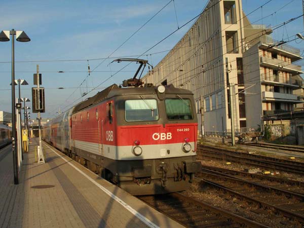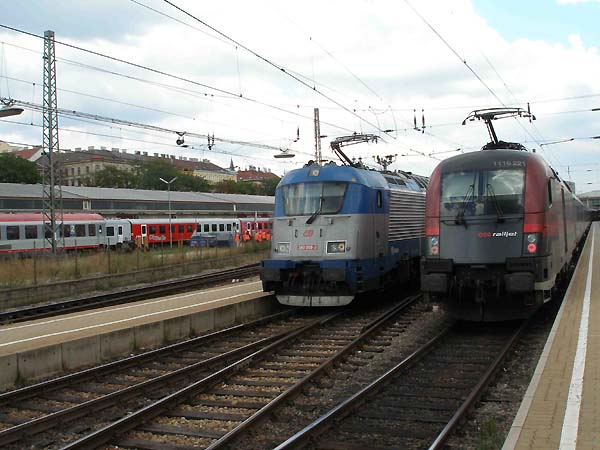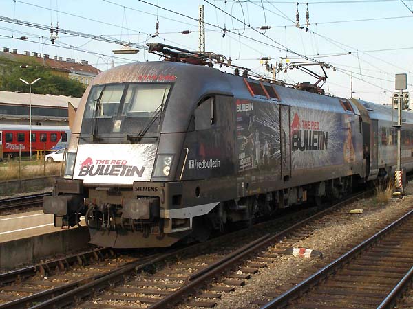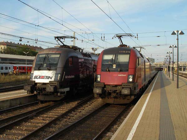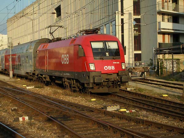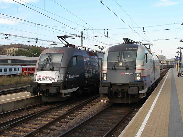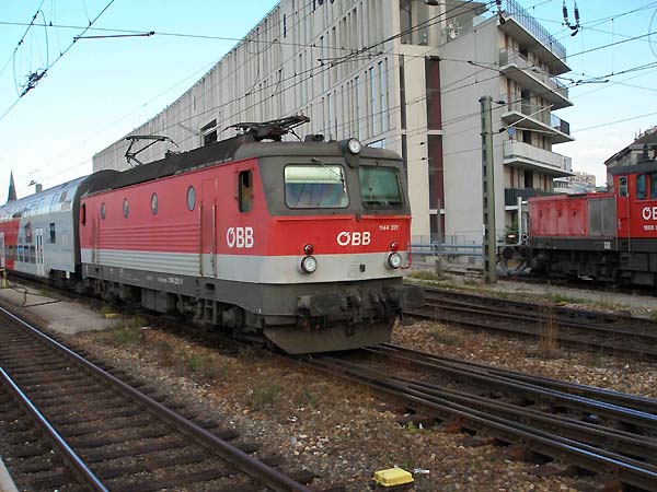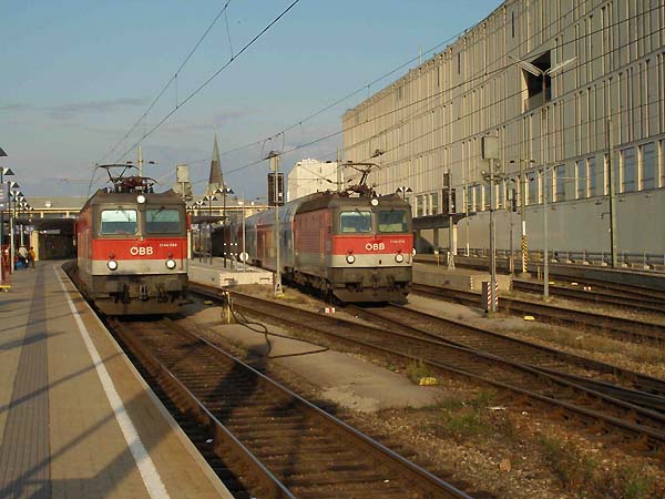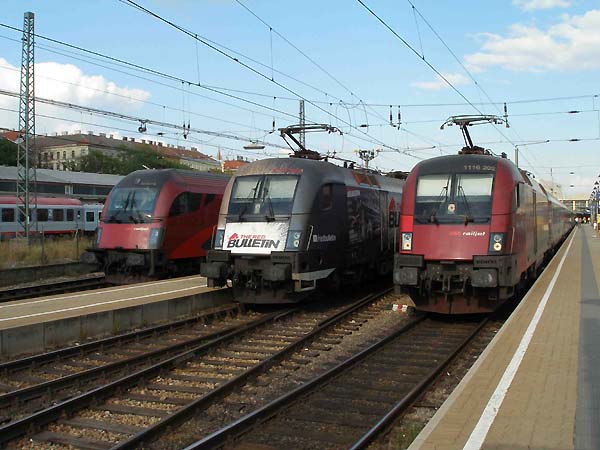CD 380 008-3 fährt mit tschechischen Waggons aus Wien West ab. Am Ende hängen 2 russische Schlafwagen. ÖBB 1116 169 in Wien West. ÖBB 1144 089 rangiert in Wien West. ÖBB 1144 089 neben 1144 074 mit REX in Wien West. RailJet-Parade mit 1116 248 redbulletin und 1116 219 in Wien West. ÖBB 1144 260 fährt mit einem REX aus Wien West ab. ÖBB 1016 020 fährt mit einem REX aus Wien West ab.