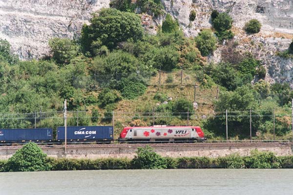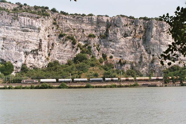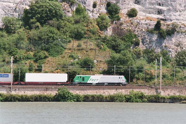 Der Legende nach fängt für die Eisenbahner der Midi, also der Süden Frankreichs, am Défilée de Donzères an. Dieser Name bezeichnet die Stelle, an der der Rhone und die Eisenbahn eine Felswand passieren, an deren südlichem Ende die Ortschaft Donzères liegt. Früher ein beliebter Fotopunkt, um Züge wie den Mistral abzulichten, die hier auf der Ligne Imperial von Paris an das Mittelmeer durchrauschten, ist die Szenerie heute eintöniger. TGV und "FRETchen" bestimmen das Bild. Am 12.07.2013 trafen wir dennoch eine bunte Mischung an.