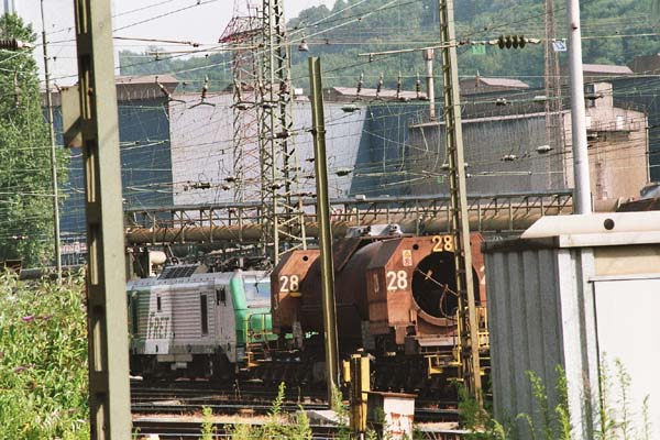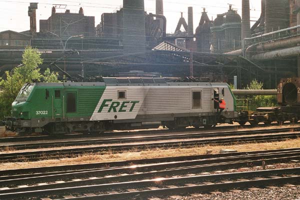 Völklingen, 15.07.2013: Nicht Frankreich, aber französische Lok: die Akiem-Leihlok BB37022 hat "Suppe" aus Dillingen geholt. Da noch volle "Suppentassen" im Bahnhof standen, hatte ich damit nicht gerechnet und konnte erst mal nur hinterherschießen. Dann erfolgte aber doch noch die fotogerechtere Aufstellung vor dem Weltkulturerbe "Völklinger Hütte". Die Roheisentransporte wickelt jetzt die Saarrail ab, mit Leihloks aus Frankreich. Im Bahnhof standen auch zwei französische Diesellok BB75000.