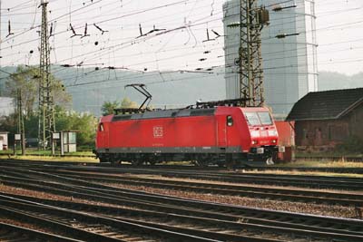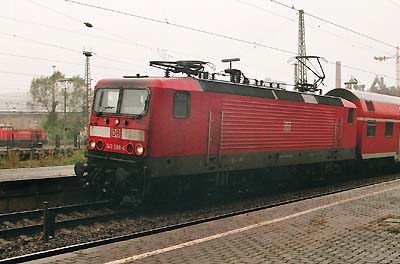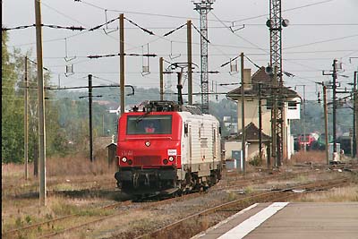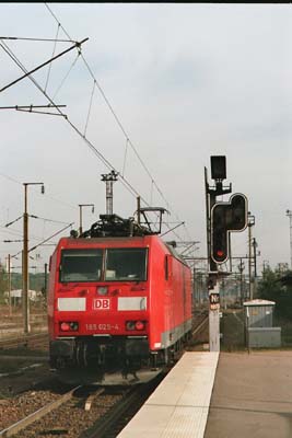 Oh, das hat sie nicht verdient. 181 215 sieht aus, als wenn jemand ihr die Nase mit Waschbenzin abgerieben hat. Die orientrote Farbe ist teilweise so ausgewaschen, dass sie nahtlos in das Lätzchen übergeht. Hättet ihr doch lieber wieder Blau genommen!!! Aus eigener Kraft umfährt das ausgeblichene Wunder dann den IC und setzt an das hintere Ende. Abgebügelt wird sie sich mit der Wagengarnitur dann von einem Rangierdiesel in die Abstellgruppe ziehen lassen.