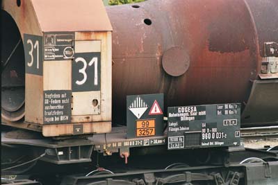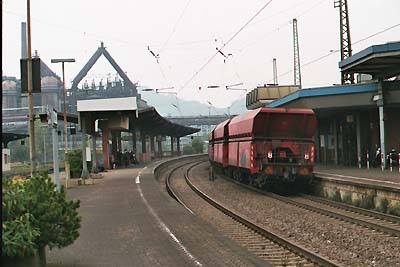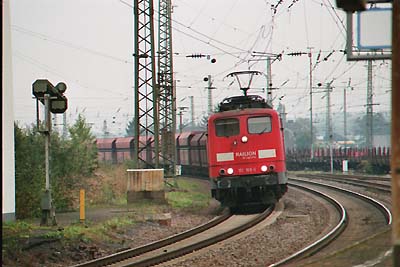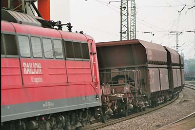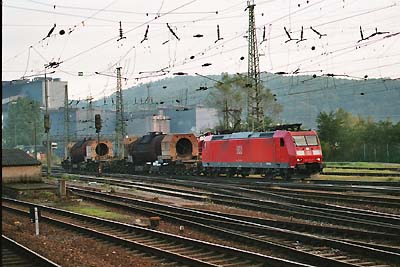 Interessanter ist dann schon die 151 169, die eine Erzleergarnitur saarabwärts schleppt. Speziell auch wegen des Zwischenwagens, der den Übergang von normaler Zug-/Stoßeinrichtung auf AK (und damit z. Bsp. Nachschub im Spessart [grins]) ermöglicht.