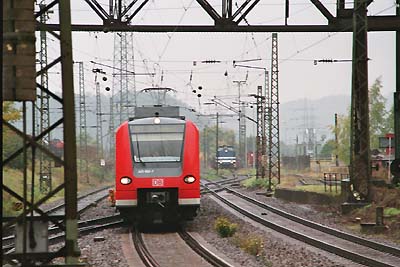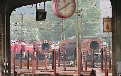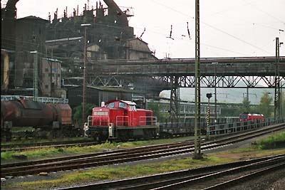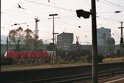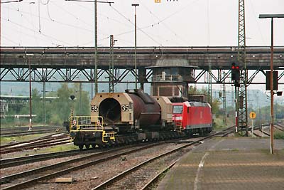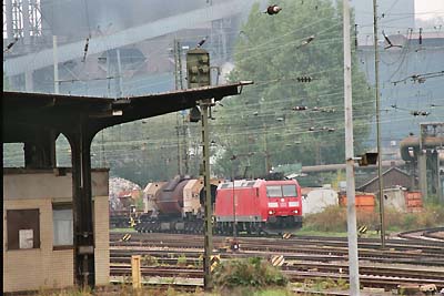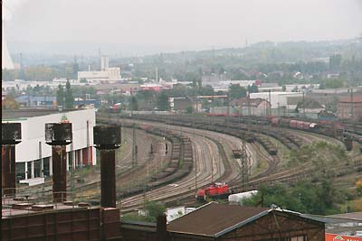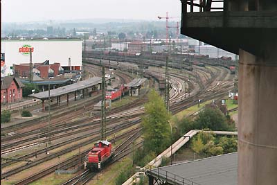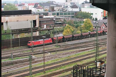 Immer wieder ergeben sich Ausblicke auf die Bahnanlagen und Loks und Züge, die vorbeifahren oder auch durch das Gelände mit Stahlzügen rollen. 294 955 war überall anzutreffen. 185 311 zog einen Güterzug vorbei, und die omnipräsenten Quietschies 425 + 426 untermalten das Ganze mit ihren „Gesangskünsten“.