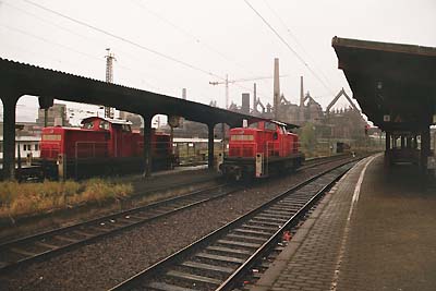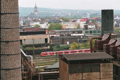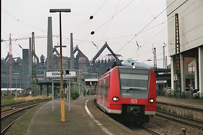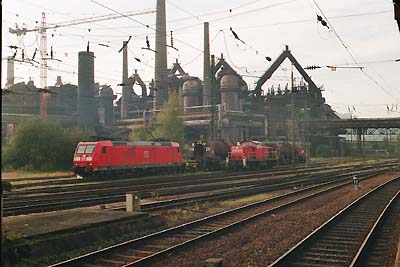 Am Montag ging es dann durch das Warndt, das saarländische Kohle- und Hüttenrevier, nach Völklingen, „Kulturprogramm“ absolvieren. Ziel war das „Weltkulturerbe Völklinger Hütte“. Die 1986 stillgelegte Anlage ist in ihrer Komplexität auf kleinem Raum einzigartig, alles, was zur Erzverhüttung nötig ist, ist hier vorhanden gewesen. Und mächtig viel Eisenbahn drum herum. Nach Osten der Bahnhof Völklingen mit seinen Gütergleisen, nach Süden ein Betriebsteil der Saarstahl. Und immer Verkehr mit Werksloks oder DB AG-V90, vom Durchgangsverkehr ganz abgesehen. Die Kirsche auf der Sahne sind dann die Roheisentransporte mit den „Suppenzügen“ oder Glühwürmchen“.