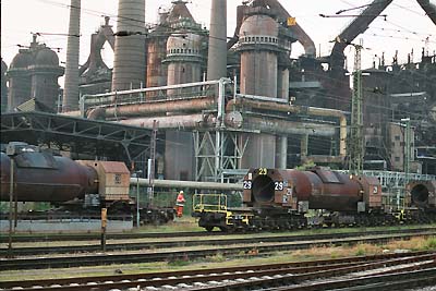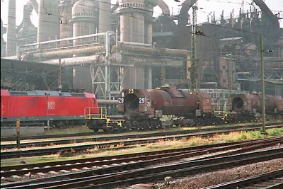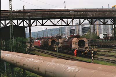 Da wir uns eh gerade unter der Abstichbühne herumtrieben, nun zu dem Thema Roheisentransport: Kaum den Eintritt bezahlt und das Gelände betreten, erspähe ich einen Torpedopfannenwagen, besser bekannt als Suppenwagen oder Glühwürmchen, der leicht vor sich hin dampft. 185 155 hat einen beladenen Wagen gebracht, der gerade von der Werkslok abgeholt wird, und soll mit zwei leeren Wagen wieder nach Dillingen zurückkehren, „Nachschlag“ holen. Der Rangierer ist noch damit beschäftigt, gnadenlos mit seinem Hammer auf die Mechanik einzuprügeln. Dann hat er endlich ein Einsehen oder sein Ziel erreicht, und die 185 kann die leeren Suppentassen in den Bahnhof zurückdrücken und anschließend abfahren.