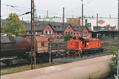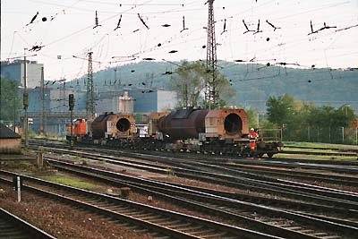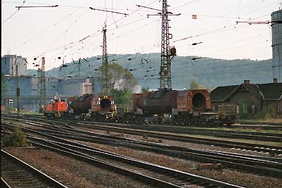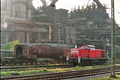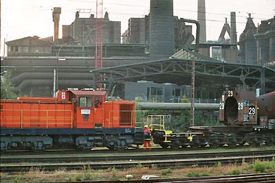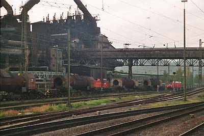 Als ich schon Angst um die Fliessfähigkeit des Roheisens habe, tut sich etwas bei der Saarstahl. Ein Henschel-Vierachser macht sich auf und sammelt zwei leere Pfannenwagen ein, um sie aus dem Werksanschluß zum Übergabeplatz zu drücken und an 185 024 zu stellen.