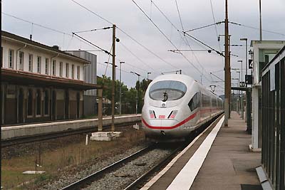 Ein ICE 3 zieht unerkannt und ohne Halt durch den Bahnhof.