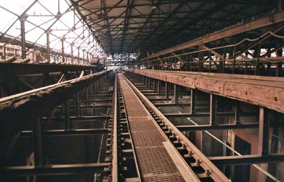 Imponierend dann die Anlagen selbst. Ein Blick entlang eines der Erzentladegleise zeigt die doch schon ansprechenden Dimensionen dieses eher kleinen Werkes. Interessant die abgenutzten Holzbohlen an den seitlichen „Geländern“, die das Aufschlagen der Wagenklappen begrenzten.