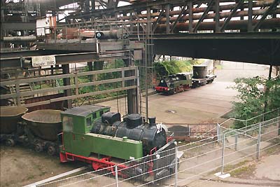 Am Eingang der Hütte empfängt die Besucher eine kleine Henschellok mit zwei Selbstentladern, die auf dem ehemaligen Kohlengleis über den Bunkern aufgestellt sind. Als Spielgerät dient noch eine Schmalspurdampflok mit einem Schlackenwagen…