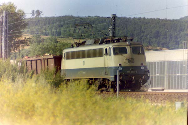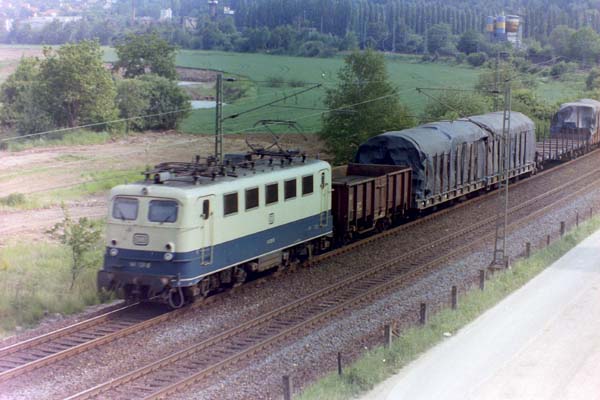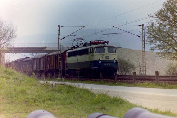 Manchmal muß man richtig arbeiten. Ich weiß leider nicht, ob das alles Planleistungen waren, aber diverse Male habe ich sie doch vor Güterzügen erwischt. Da ich seinerzeit teilweise längere Freizeit hatte, konnte ich auch länger am Bahndamm auf Kuriositäten warten. So am 14.Mai 1985 die 110 372 vor einem Güterzug vor dem nördlichen Einfahrsignal von Alfeld.