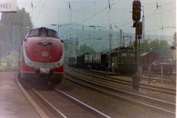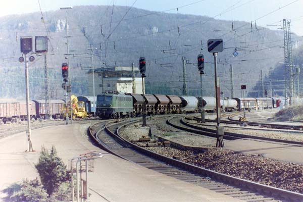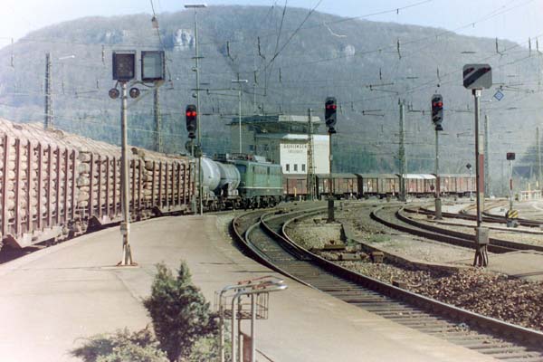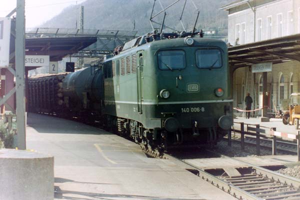 Und es geht doch: Am 14.April 1988 schiebt 140 006 in Geislingen einen Güterzug samt Schwester 140 107 über die Steige. Kurzes Gastspiel für die E 40. Bei uns hat sie ja auch schwere Zeiten gehabt. Um Altenbeken herum sind sie nach der Elektrifizierung manchmal liegengeblieben, wenn in den Steigungen das Signal rot war. Da musste die 44 aus Ottbergen Dienst machen, bis 150er frei waren. Für Berge sind mehr als 4 Achsen und Masse halt besser, auch deshalb wird an der Steige ja auch wieder mit Sechsachsern gedrückt…