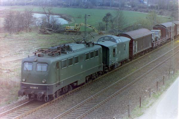 Am 24.04.1986 hat 140 086 einen ähnlichen Zug in Gegenrichtung zu befördern. Interessant ist die Kennzeichnung FFA auf dem Begleitwagen, als erstes impliziert das als Besitzer die „Forces Francaises en Allemagne“...