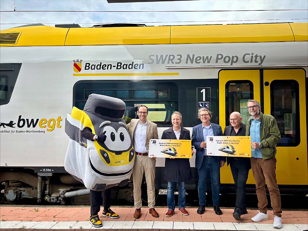 11.06.2025 Zugtaufe: 'SWR3 New Pop City Baden-Baden' im Rheintal unterwegs.. Desiro HC Nahverkehrszug auf den Namen „SWR3 New Pop City Baden-Baden“ getauft • Botschafter des „SWR3 New Pop Festivals“ und der Stadt Baden-Baden wird zwischen Karlsruhe und Basel fahrenDB Regio Baden-Württemberg hat heute (10.06.2025) gemeinsam mit SWR3, dem Ministerium für Verkehr und der Stadt Baden-Baden einen Des... |